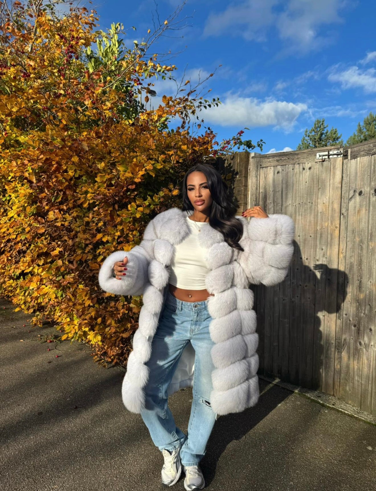 A longline horizontal row fox coat in stunning natural fox white, custom colours available. This coat can be made into a gilet with detachable sleeves and made shorter with detachable lower section.